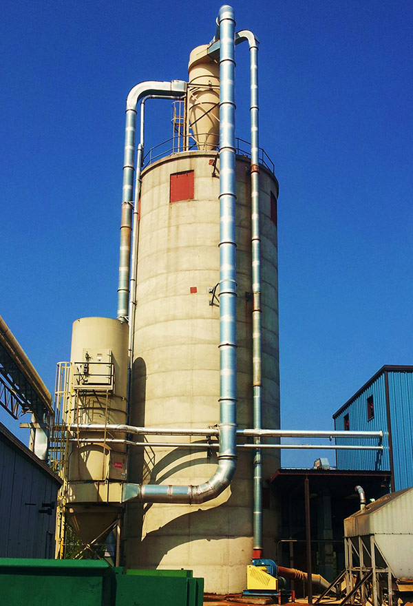 The bag house separate the air from the dust in large quantities. often the heavy dust concentrate is then conveyed pneumatically to a truck or dumpster load out station. The heavy concentrate of dust is then separated further by the cyclone’s centrifugal force. Another application of a cyclone is when collecting wood chips or shavings that are non res-portable. The cyclonic separation of the dust from the air is often efficient enough to use the low maintenance cyclone in place of the bag house.