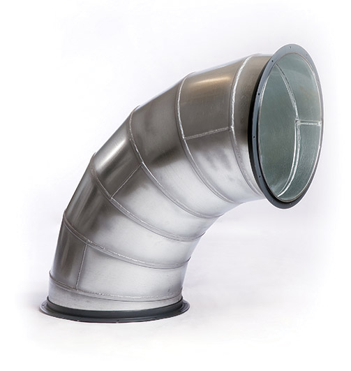 Long radius (2.5) elbows in galvanized steel with flanged ends and machine gored and caulked for a smooth seal. Order 90°, 60°, 45°, or 30°.