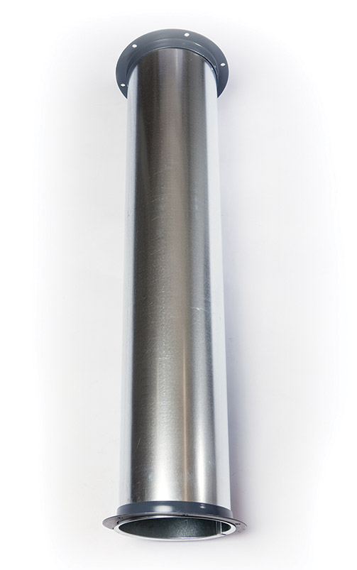 These galvanized steel pipes have welded solid longitudinal seams in each five-foot section. The ends are flanged to make ductwork easy to assemble and disassemble.